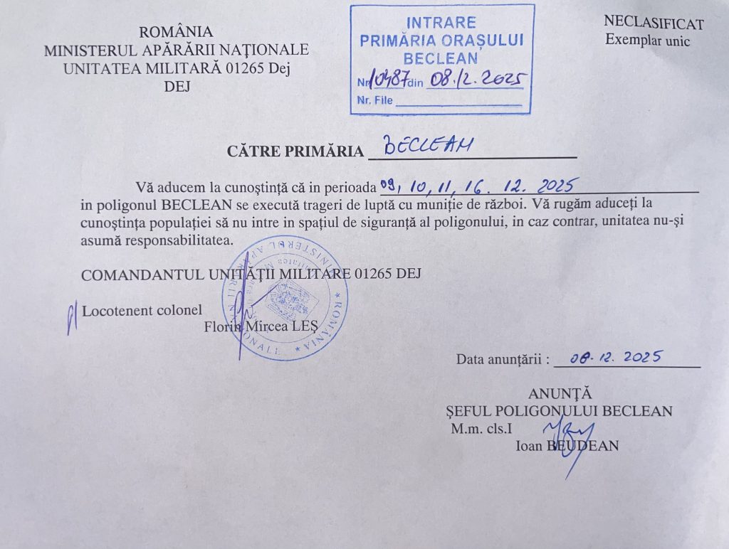 Anunț trageri în Poligonul Beclean – 09, 10, 11, 16 decembrie 2025